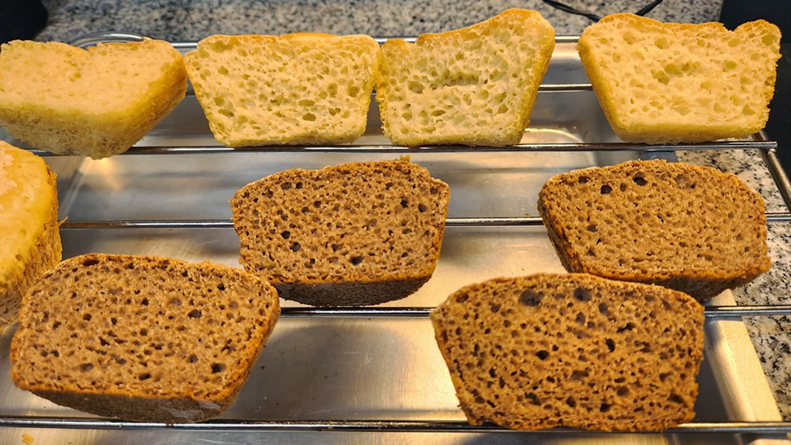 Una vez alcanzado un buen porcentaje de granos en este punto de germinación, el equipo obtuvo una harina de alto valor nutricional con la que comenzó a ensayar la incorporación a formulaciones de pan de trigo. Así, llegaron hasta el reemplazo de un 30 por ciento de este cereal, obteniendo panes de muy buena calidad tecnológica y mejorando marcadamente el aporte de fibra alimentaria, el cual es muy bajo en los panificados tradicionales que llevan solo trigo. Además de la harina germinada, el equipo también realizó pruebas con harina de teff extruida producida por el área de Desarrollo de Nuevos Productos del Instituto Nacional de Tecnología Industrial (INTI), bajo la dirección de Mariana Sánchez. En ambos casos, los resultados en cuanto a volumen y calidad de los panes son buenos; más prometedores, incluso, que los arrojados por las pruebas preliminares. Cabe mencionar que los ensayos se llevan adelante con granos cedidos voluntariamente por una de las pocas empresas que cultiva y comercializa teff en la Argentina. “El desafío fue ir regulando las proporciones de reemplazo para que no se vea tan afectado el volumen del pan ni otras propiedades como el sabor, aroma, textura y aspecto en general. A futuro, el proyecto incluye lograr lo mismo pero en productos libres de gluten”, explican el investigador y las investigadoras.